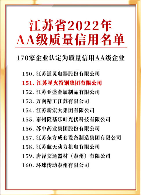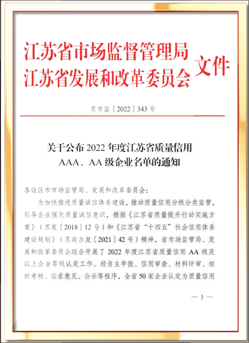 省市场监管局、发展和改革委员会联合开展了,2022年度江苏省质量信用AA级及以上企业等级认定工作,50家企业认定为质量信用AAA级企业,170家企业认定为质量信用AA级企业。